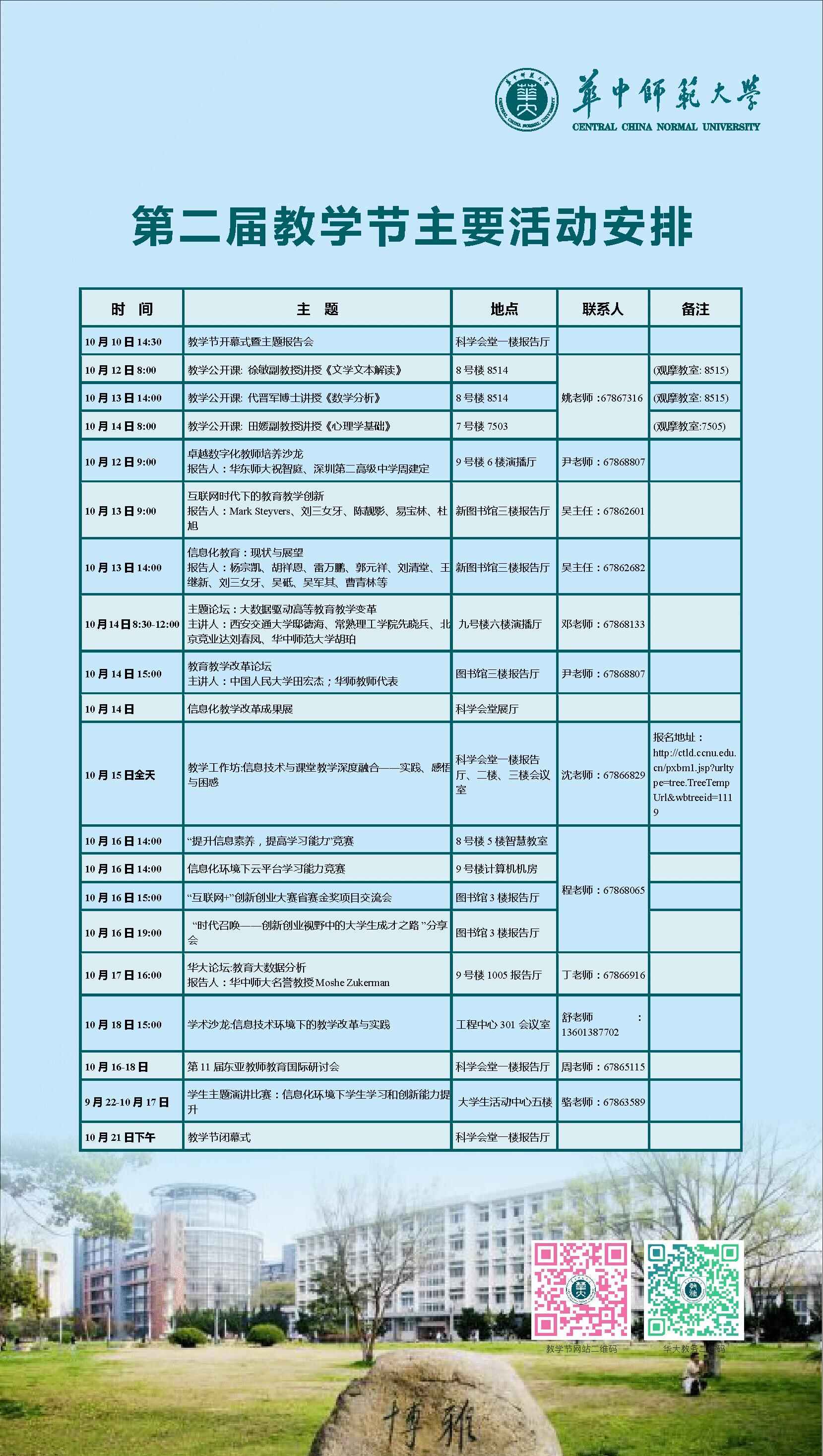 有关活动详情及报名请即时通过华中师范大学教学节网站(http://jxj.ccnu.edu.cn)、教学节网站二微码、教务处微信公众号、教学节报名二微码查询,或联系华中师范大学教学节组委会办公室(教务处),联系人:万枞、周义,联系电话:027-67866966,027-67868057。