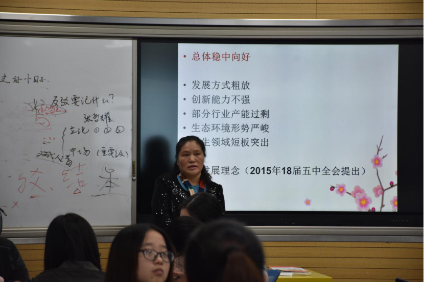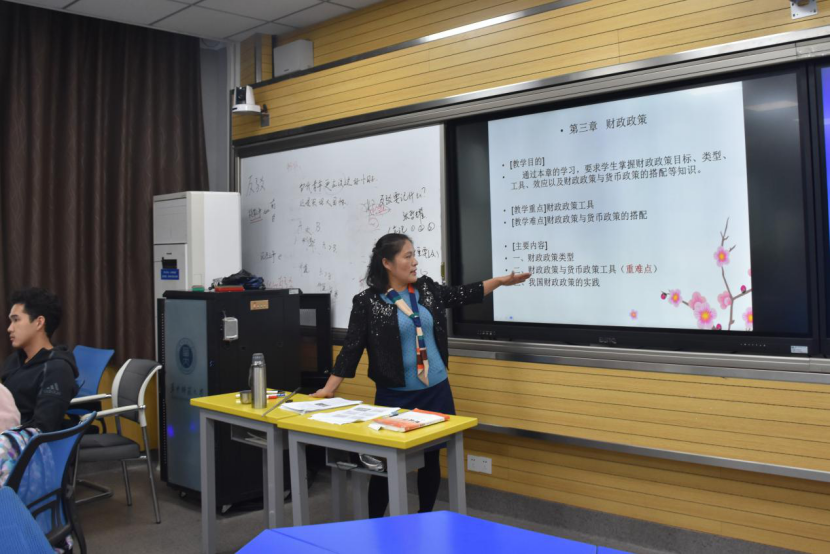 接着,课堂进入正题,何老师以2018年第一季居民收入的总体趋势和存在问题为切入点,展开了对财政政策工具的讲解。她让同学从具体案例中思考,组织小组讨论,并请同学代表发言。何老师认真倾听同学们的发言,并给出看法和意见。随后,何老师以具体事例出发,就“政府如何用税收对经济进行调控“进行详细讲解,通过对自动稳定的税收政策工具和相机抉择的税收政策工具两类税收政策工具的介绍,让同学们了解了如何在不同的经济环境及形势下对经济进行宏观调控。