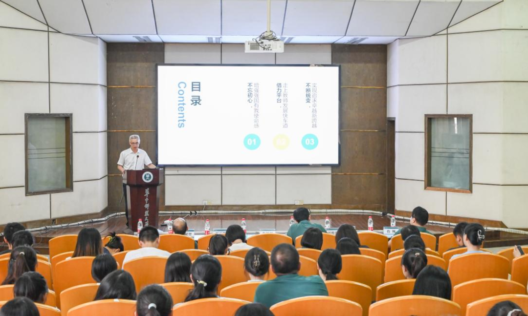 87级校友、武汉市第四十九中学校长胡正茂围绕“如何做好教师的专业发展”的问题作报告。他谈到,“从事教师事业,要有三个方面的特质,第一要耐住寂寞,心向远方,志存高远;第二要主动出击、创造机会、突破自我;第三要潜心研究、聚焦美好、打造品牌。”