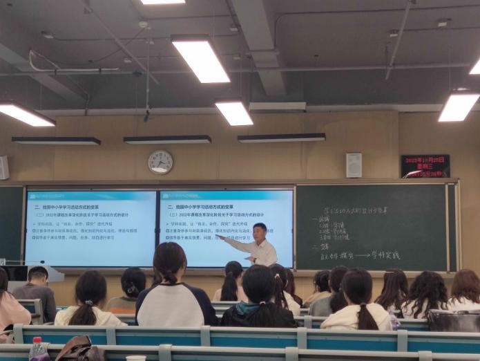 伍远岳以知识关联、问题聚焦、情境创设等方式,引出本节课的主要内容“学习活动方式的设计与变革”,通过知识讲解、讨论交流等方式,巧妙让学生理解影响学习活动方式设计的三大依据,使学生明确我国基础教育课程改革关于学习活动方式设计的变革趋势。