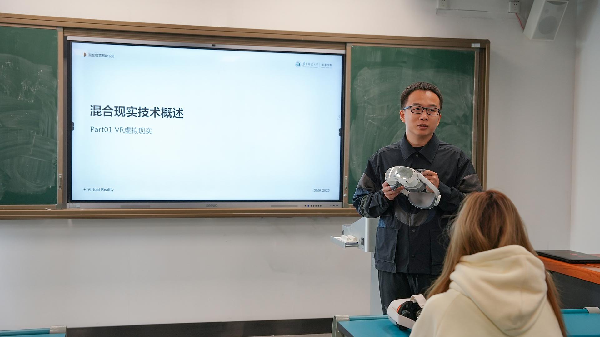 为深入贯彻落实党的教育方针,开发优质课程资源,根据学校第九届教学活动安排,11月29日上午,美术本科优质课程展播活动顺利开展。美术学院李子健老师为2021级数字媒体艺术专业学生讲授的《混合现实互动设计》课程,在八号楼8704教室进行了线上线下同步展播。