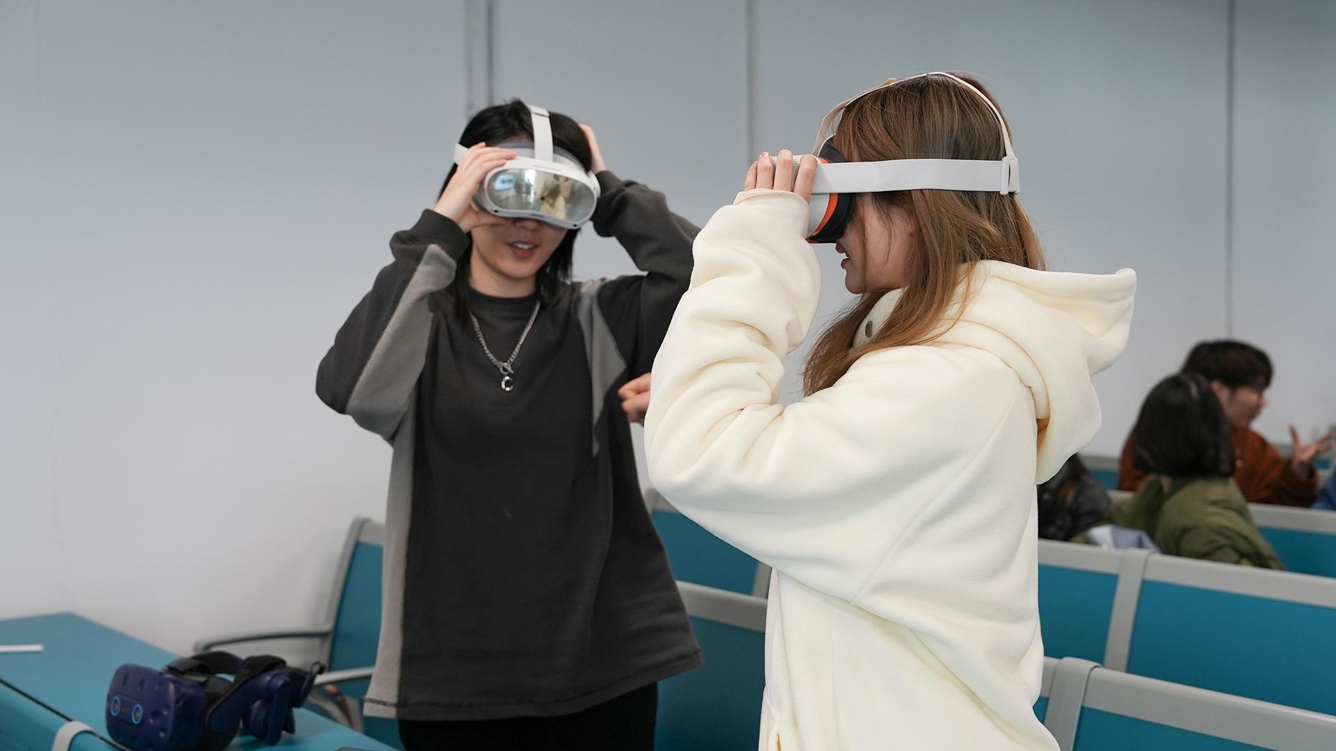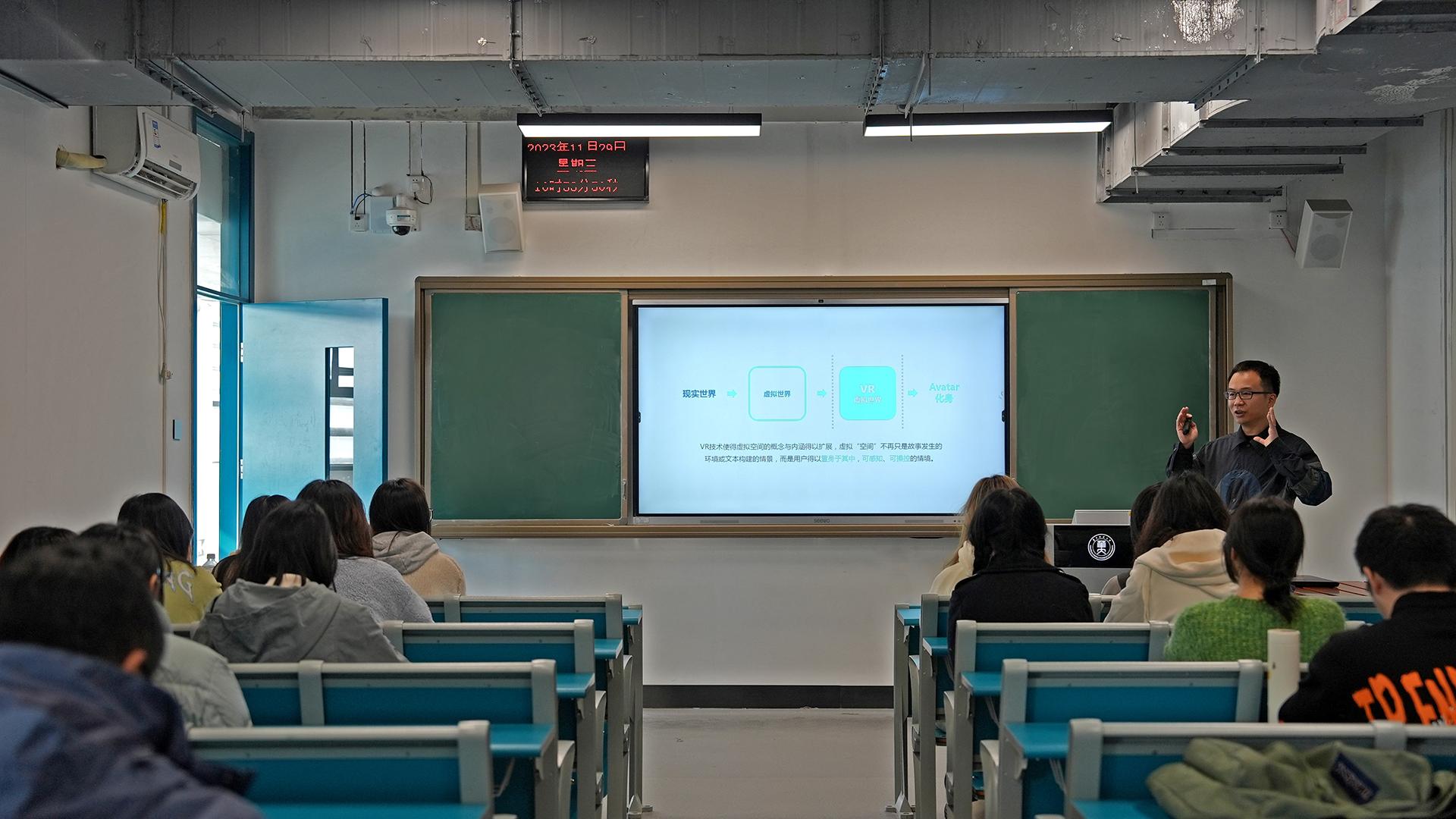 李老师首先对VR技术的发展进行了逻辑梳理,并结合其发展阶段典型案例,探讨VR技术的核心是什么,及其优劣势。并通过用户体验的视频案例,使学生们感受到VR头戴式设备构建了一个与现实完全隔离的虚拟感知空间,营造了直接、无中介的“虚拟世界”感知体验,这是与常规屏幕等显示媒介的本质区别。