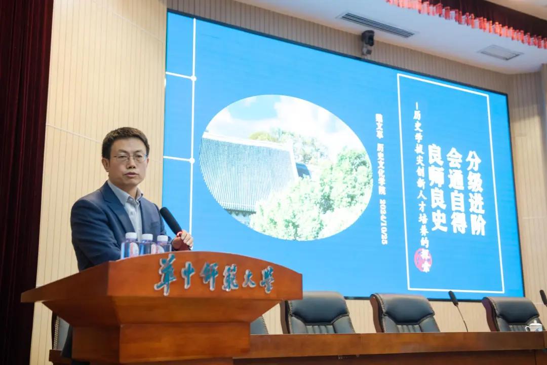 历史文化学院院长魏文享和计算机学院副院长谢伟作主题发言。魏文享结合历史文化学院的教育教学改革实践,分享了创新育人机制、推进人才自主培养的经验。他表示,人才培养方式上要侧重知识能力的阶段性目标,落实制度管理与保障。